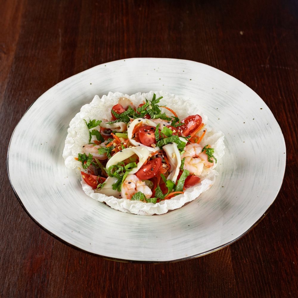 Креветки, свежий огурец, красный болгарский перец, красный лук, ростки сои, кинза, мята, соус из маракуйи.