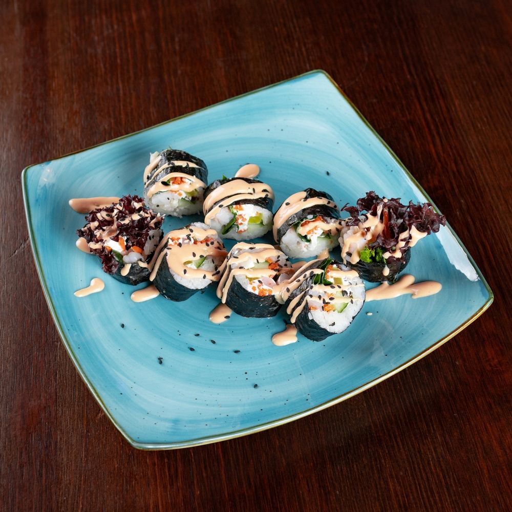 Корейский ролл с рисом, овощами и нежной креветкой.