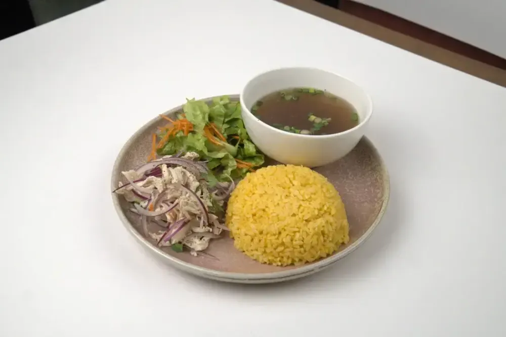 Отварной рис, дополненный куркумой и кокосовым молоком с отварной куриной грудкой и свежим салатом.