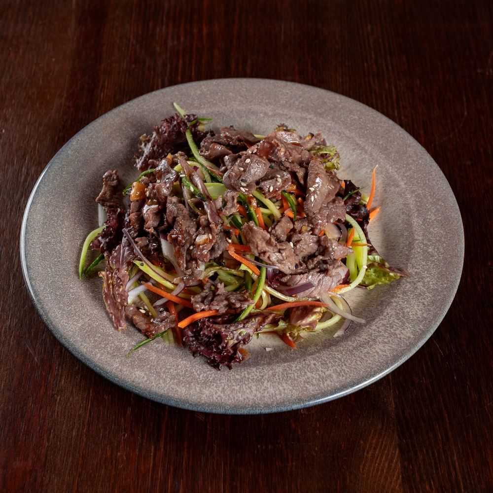 Обжаренная говядина, огурец, болгарский перец, лук, стебель сельдерея, морковь, кинза, мята, арахис.