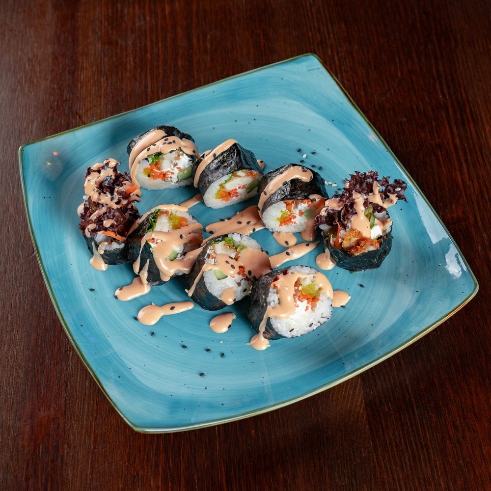 Корейский ролл с рисом, овощами и хрустящей курицей темпура.