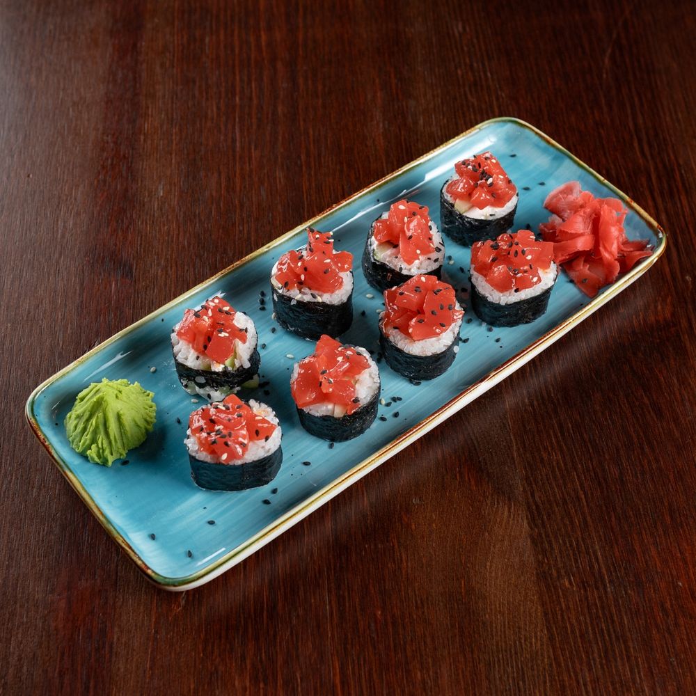 Ролл с тунцом, рисом, огурцом, водорослями нори.