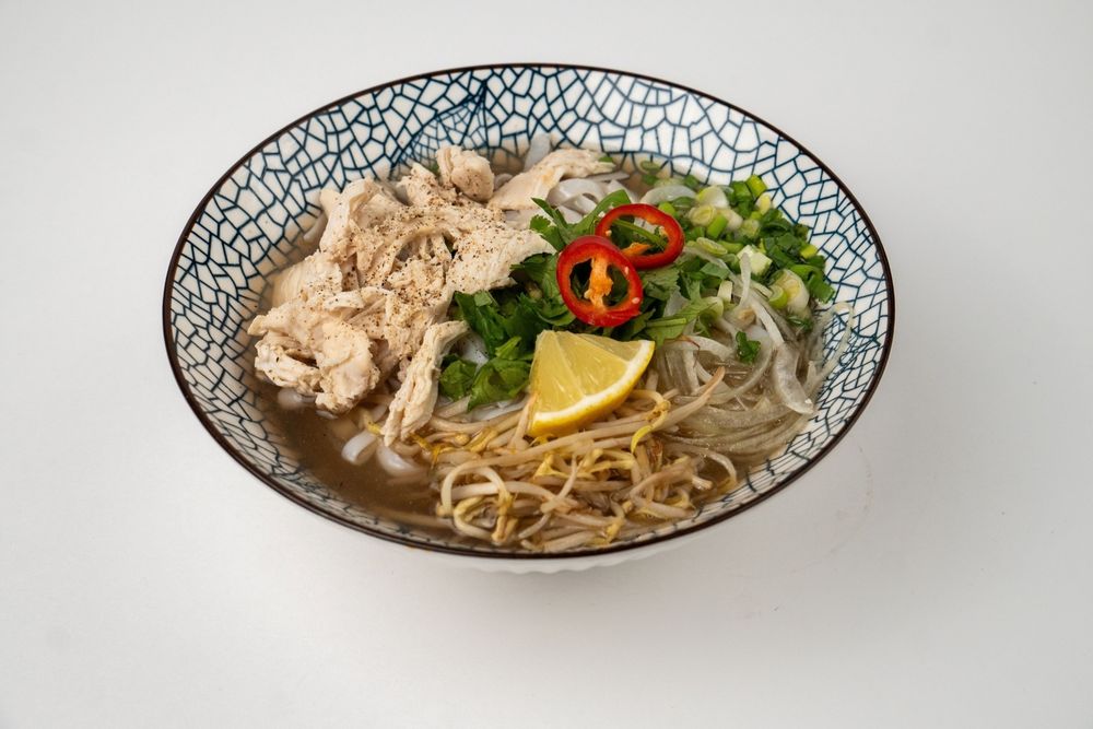 Традиционный суп с рисовой лапшой, отварной куриной грудкой, красным и зеленым луком, ростками сои, свежей зеленью и говяжьим бульоном.