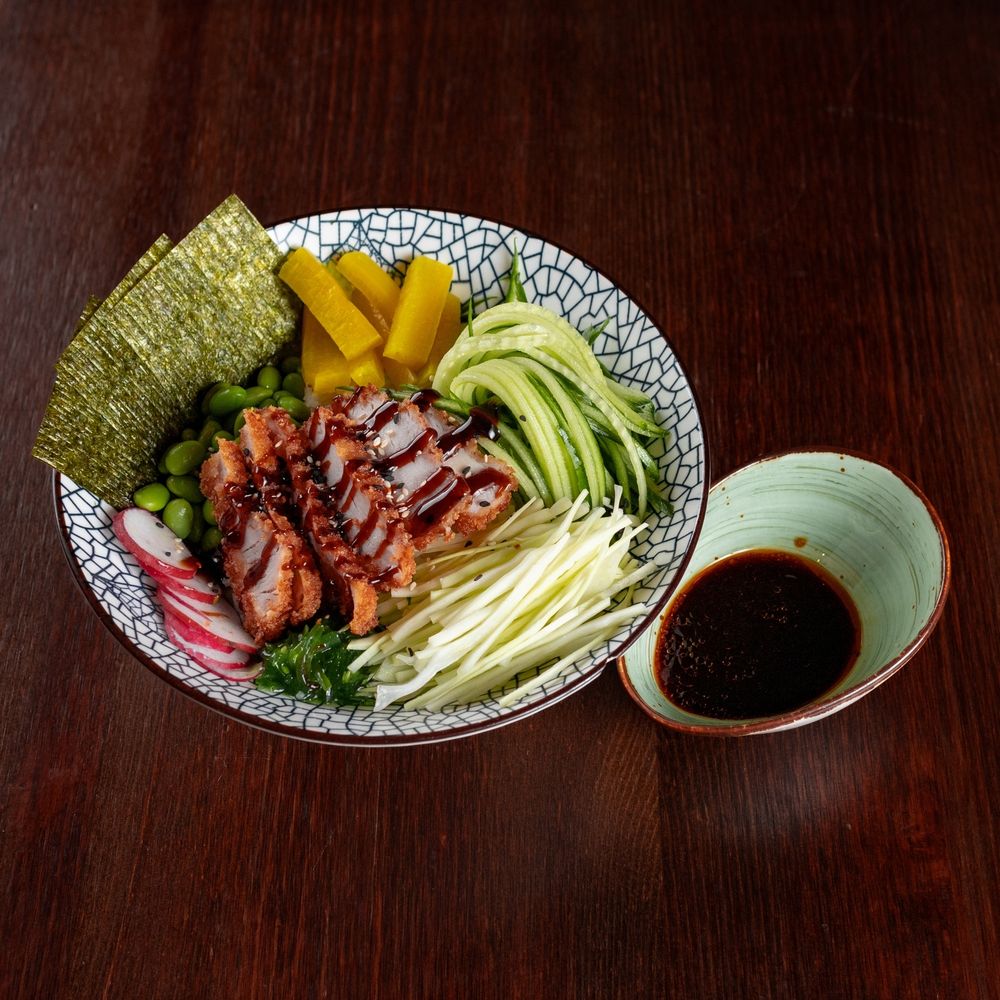 Паровой рис, курица темпура, редис, огурец, бобы эдамаме, салат чука, ростки сои, маринованный дайкон, водоросли нори.
