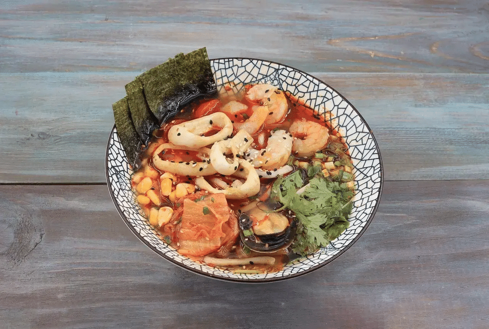 Бульон на основе пасты том ям и кокосовых сливок, пшеничная лапша, креветки, кальмар, томаты черри, капуста ким чи, водоросли нори, кунжутное масло, кукуруза в зернах, зеленый лук.