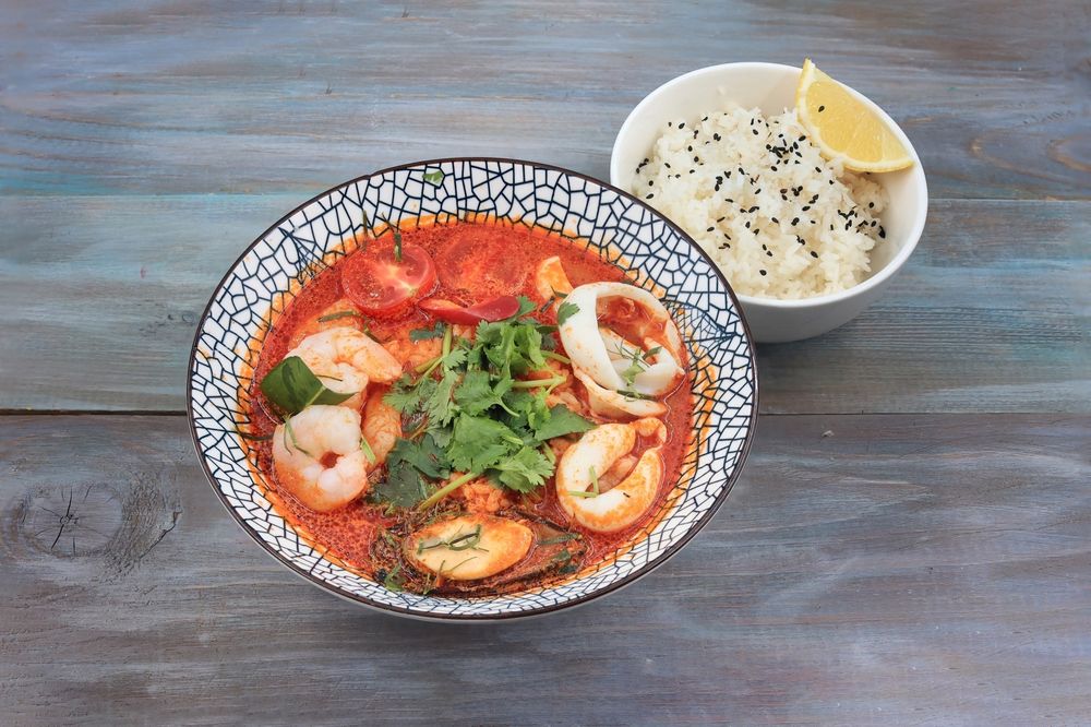 Суп на основе пасты том ям с креветкой, кальмаром, мидией, кокосовым молоком, вешенками, томатами черри и рисом.