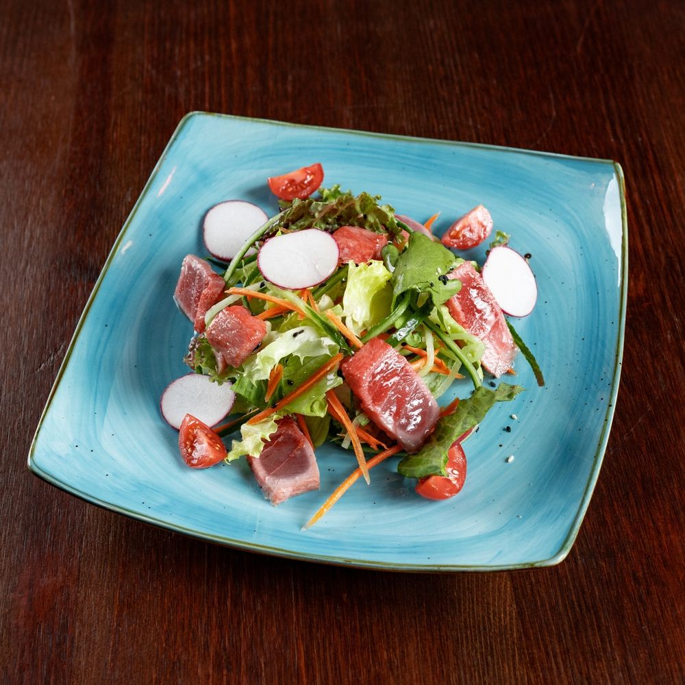 Тунец, салат айсберг, морковь, томаты черри, красный лук, редис.